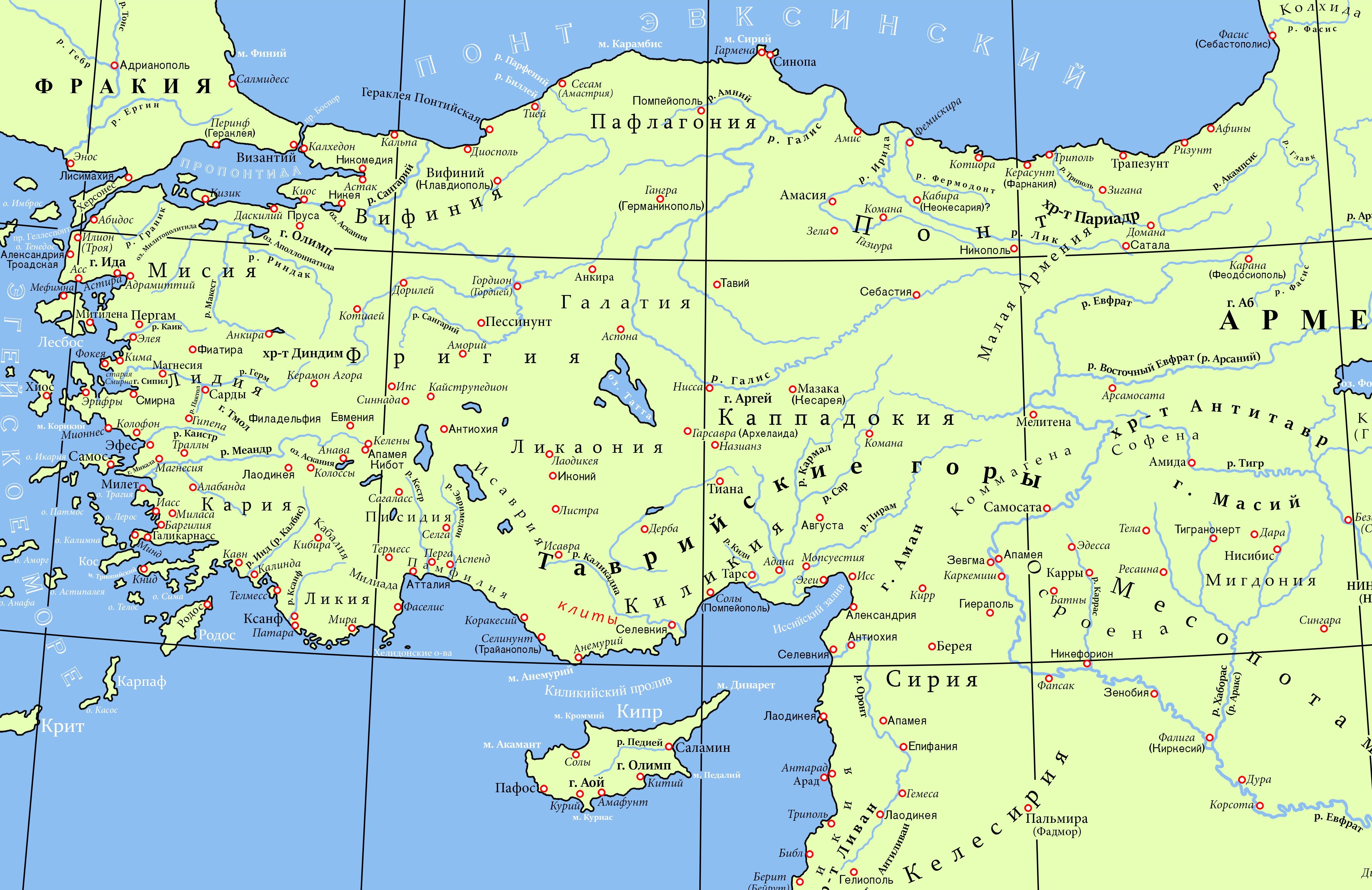 1. Малая Азия в эпоху Античности. На основе карты Karte von Kleinasien in der Antike mit römischen Provinzen (F. W. Putzgers Historischer Schul-Atlas. 1901). Отрисовка и перевод на русский язык Петра Тарасьева. Источник: Википедия. Ст. Малая Азия.
