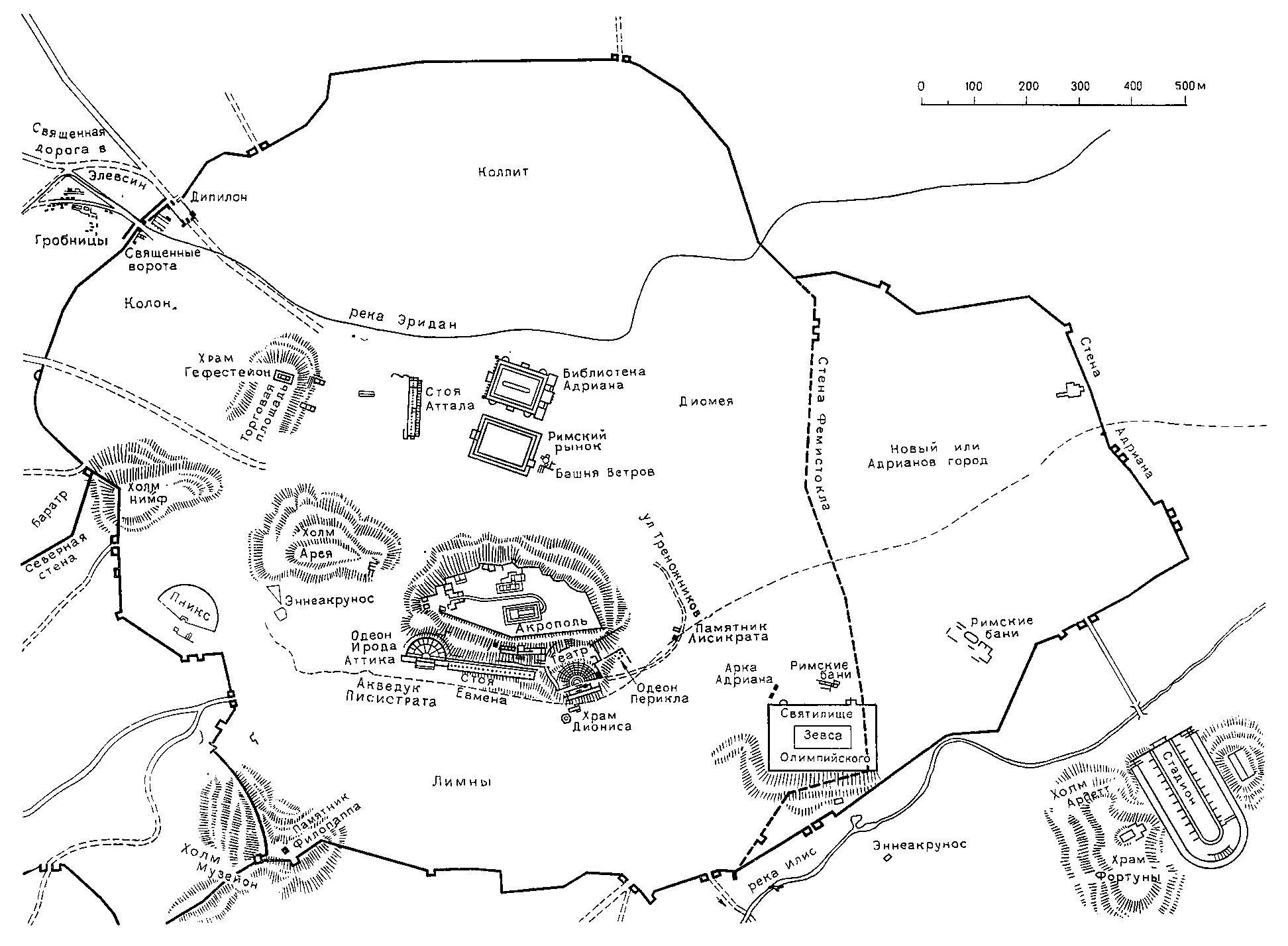 2. Афины II века н.э. Схема. На основе схемы из учебного пособия: Иванова К. Г. Основы теории градостроительства. Владимир: Владимирский государственный университет. 2022. Электронное издание. С. 18.