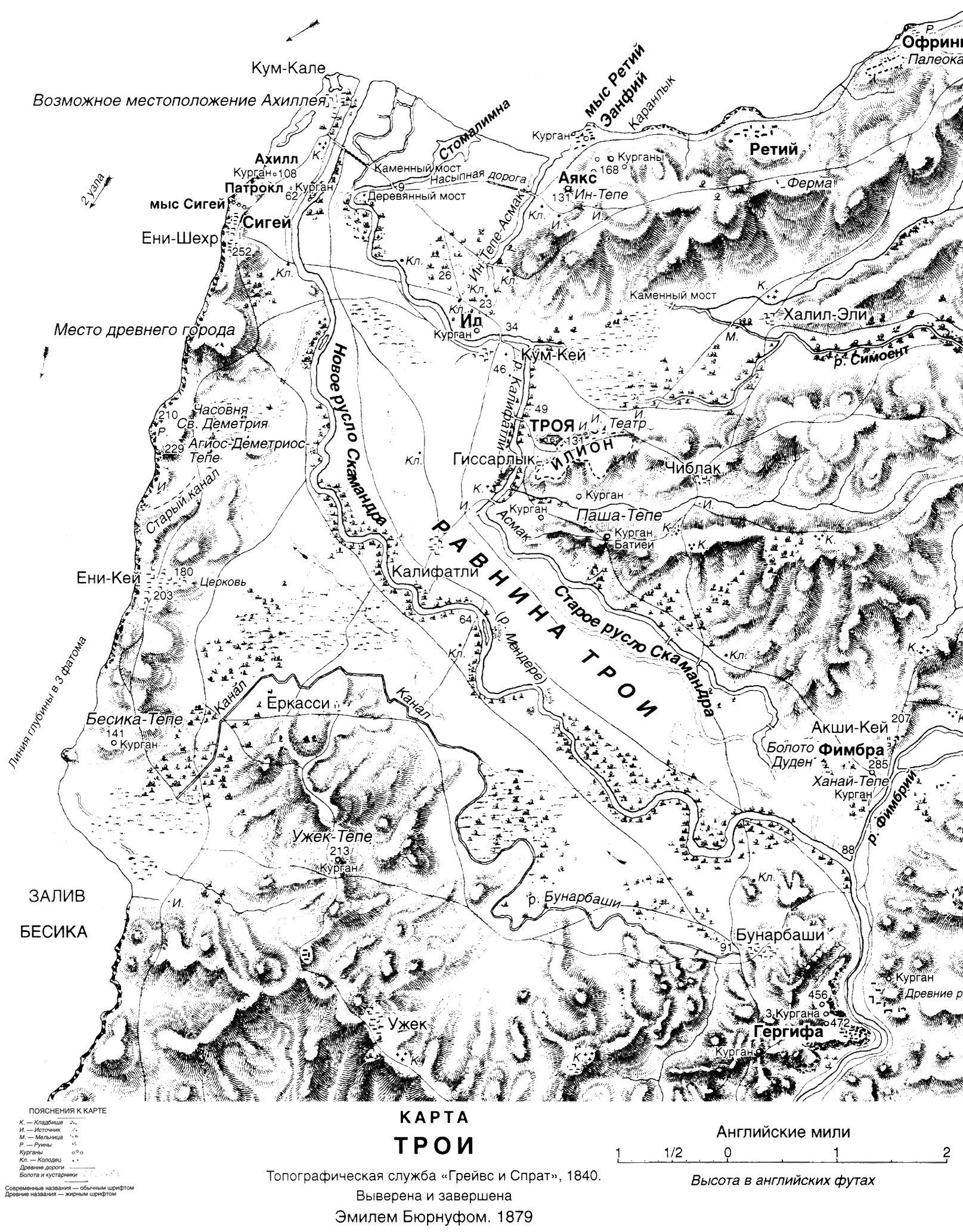 3. Окрестности Трои по состоянию на 1879 год н.э. Фрагмент карты из книги: Шлиман Г. Илион. Т. 2. М.: Центрополиграф. 2009.